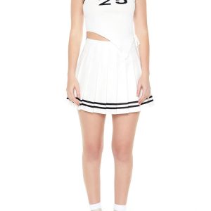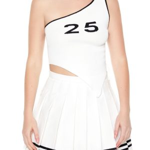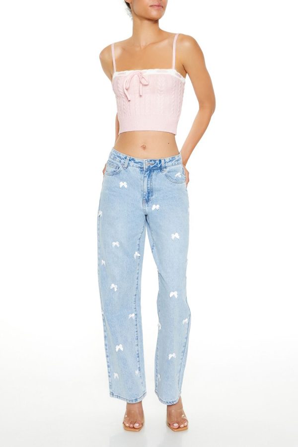 A cable sweater-knit cami featuring a self-tie bow chest closure. a straight-cut neckline and back. adjustable straps. ribbed trim. and cropped hem.