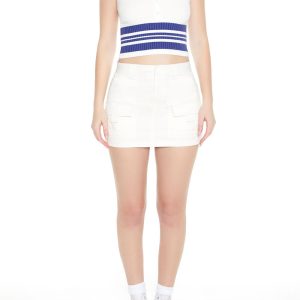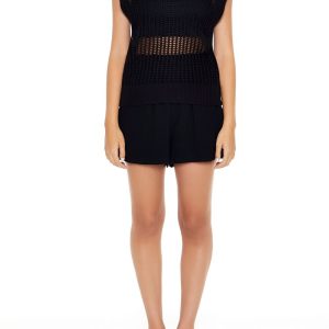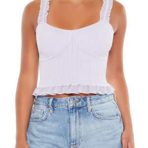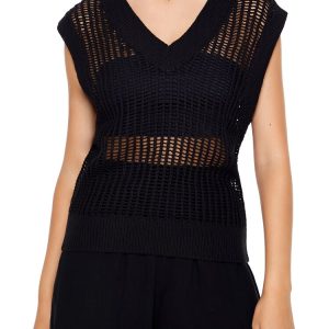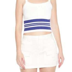 A sweater-knit top featuring a cable knit construction. shoulder straps. a scoop neckline and back. and cropped hem.
