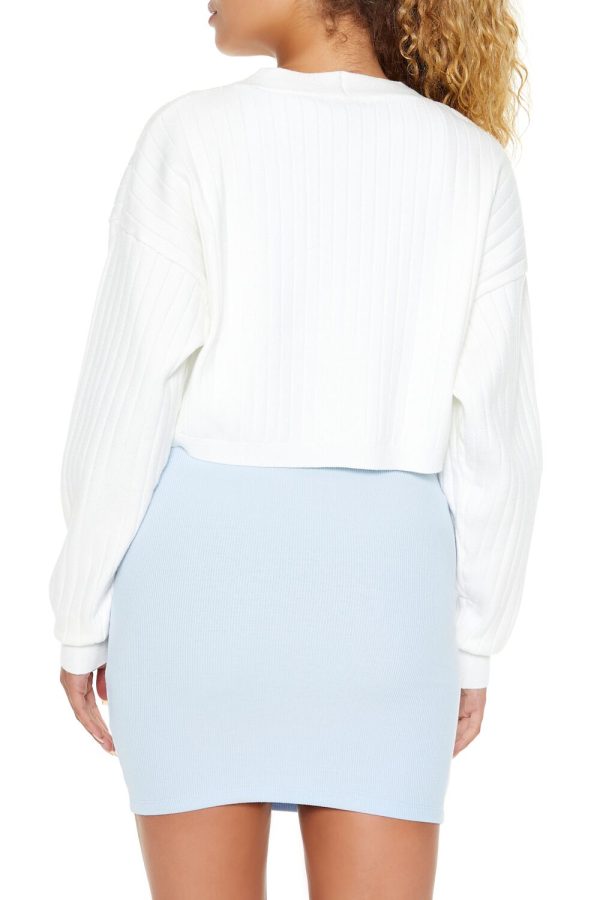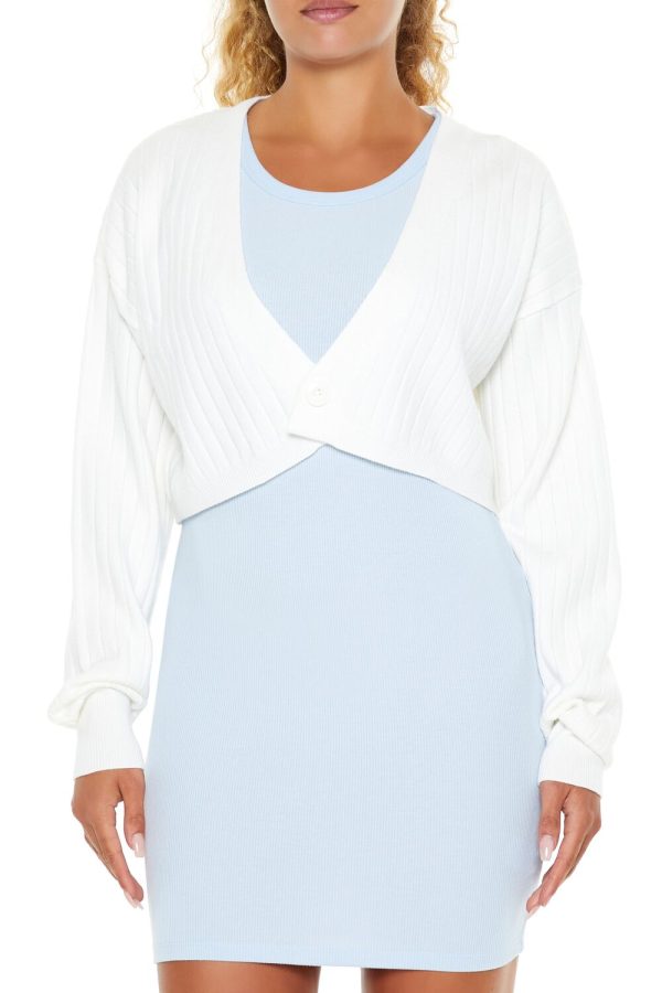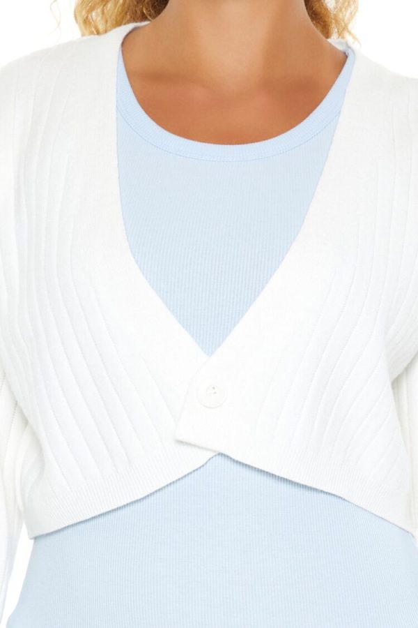 A ribbed knit cardigan sweater featuring a cropped hem. dropped long sleeves. a V-neckline. and single button closure.