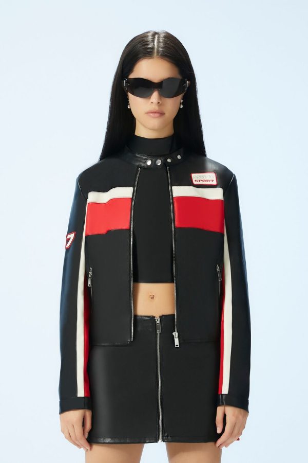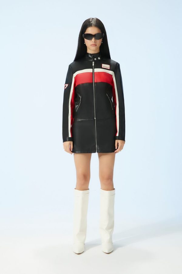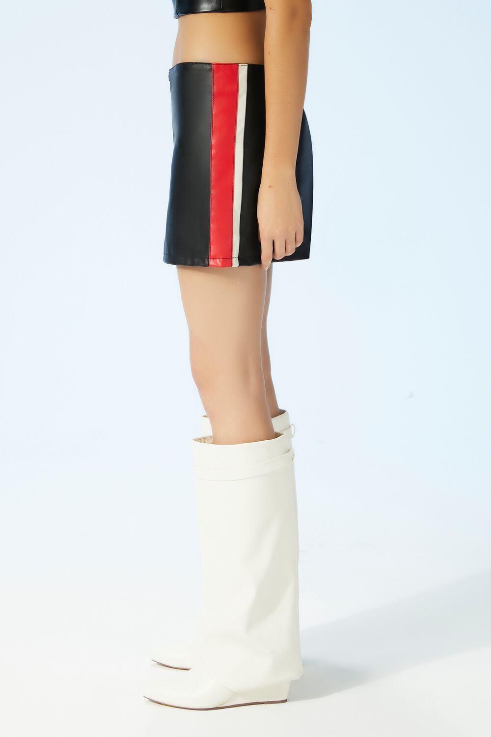 A faux leather skirt featuring a mini length. high-polish front zipper. and contrasting side stripes.