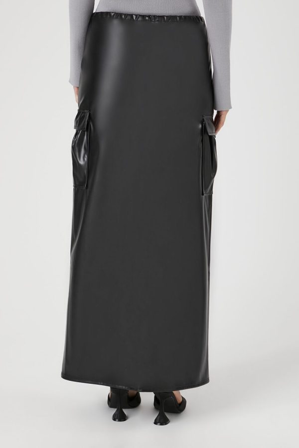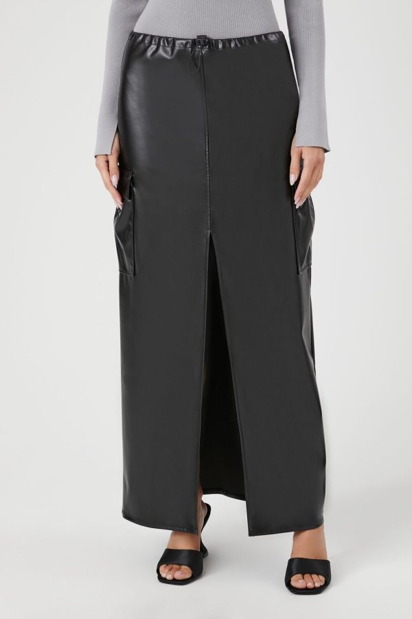 A faux leather midi skirt featuring a toggle drawstring waist. leg cargo flap pockets. front leg slit. and a straight silhouette.