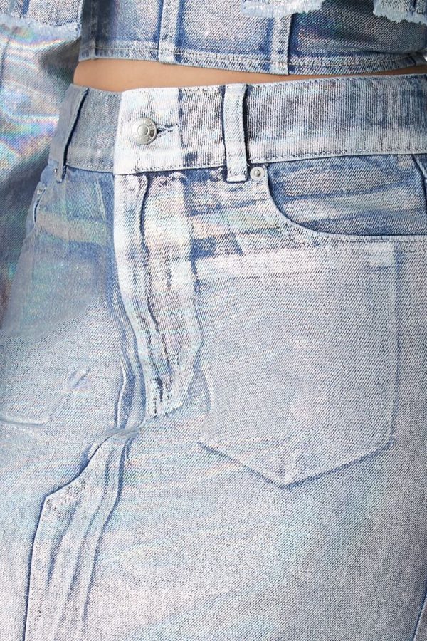 Crafted from non-stretch denim. this maxi skirt features an iridescent finish. five-pocket construction. high-rise waist. zip fly with button closure. and a front leg slit.