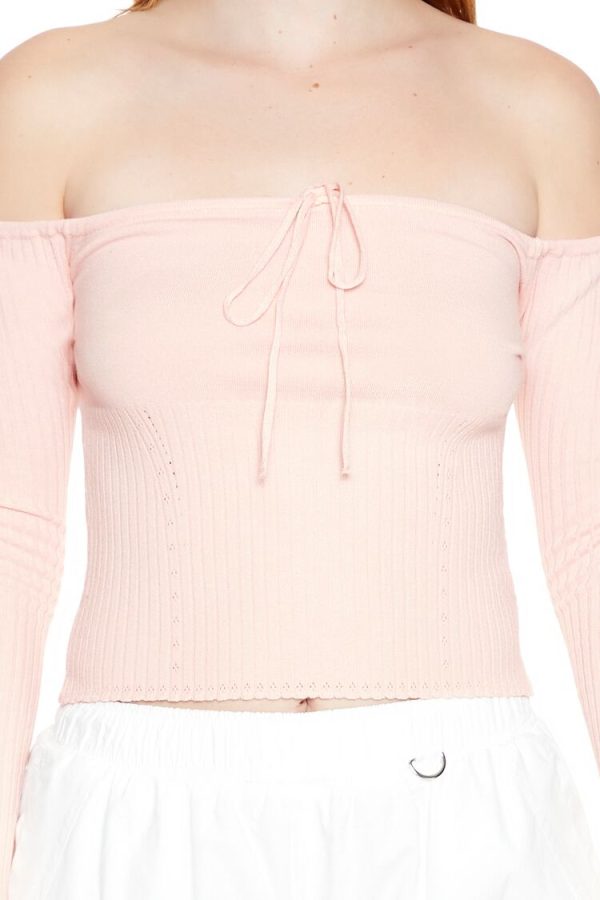 A sweater-knit top featuring an off-the-shoulder neckline. allover ribbed construction. self-tie closure at the chest. long sleeves. fitted silhouette. and a semi-cropped hem.
