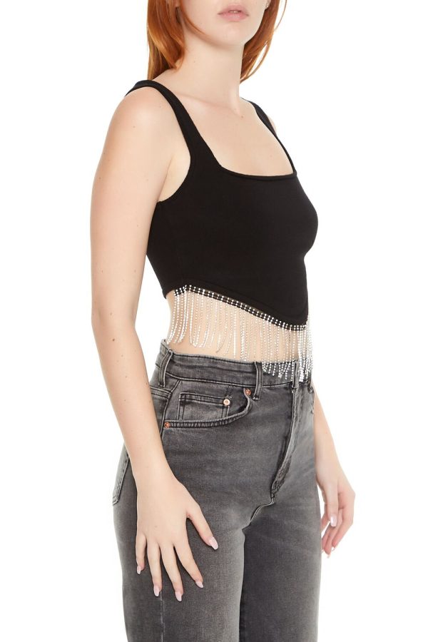 A sweater-knit crop top featuring shoulder straps. a square-cut neckline and back. rhinestone fringe trim. and a V-hem.