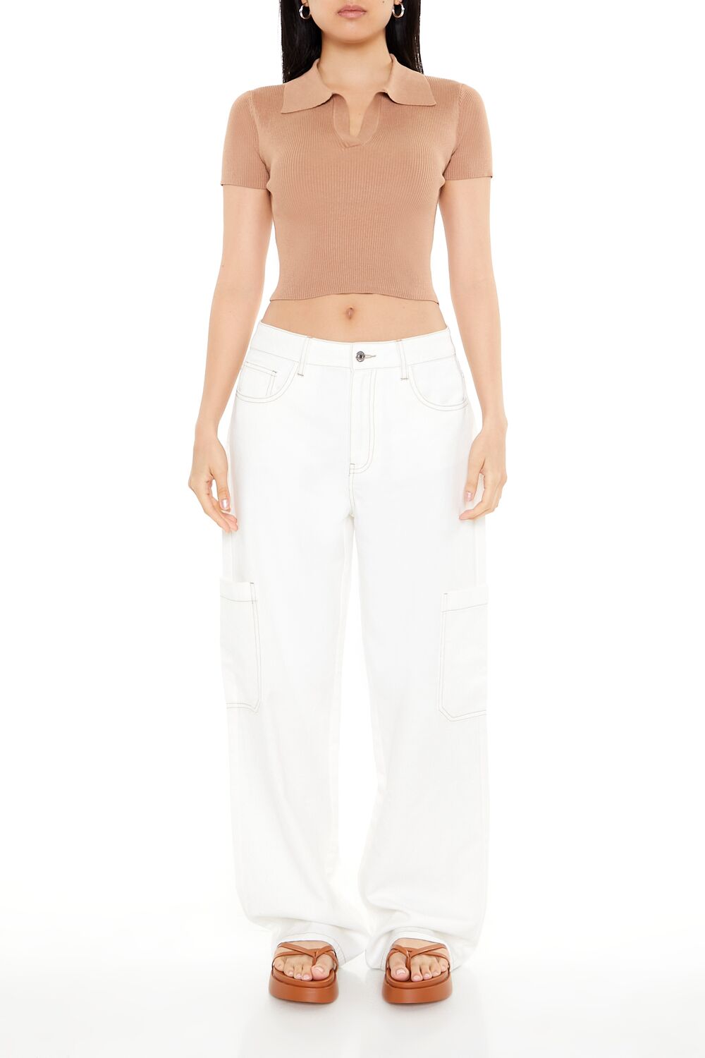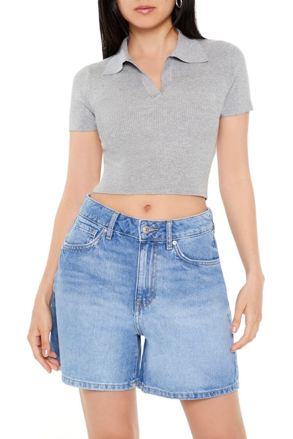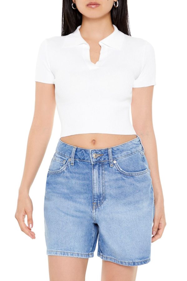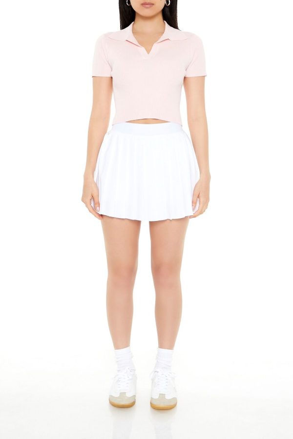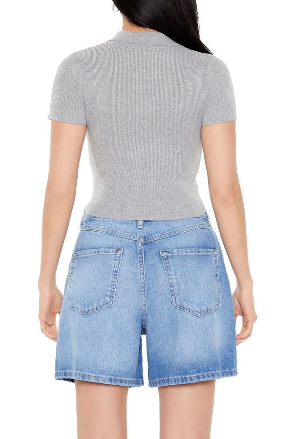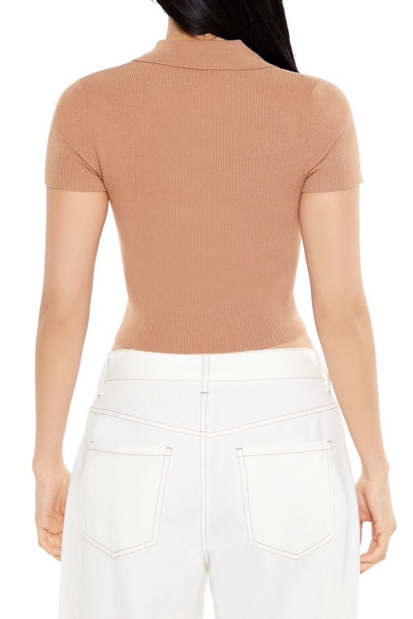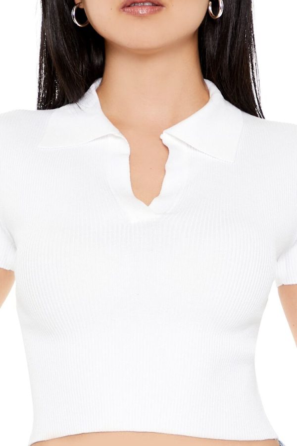 A ribbed sweater-knit top featuring short sleeves. a basic collar. split neckline. and a cropped hem.