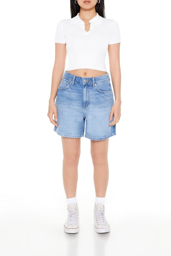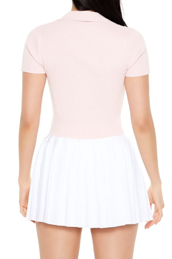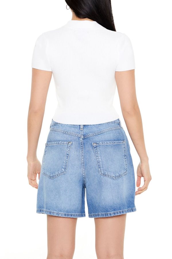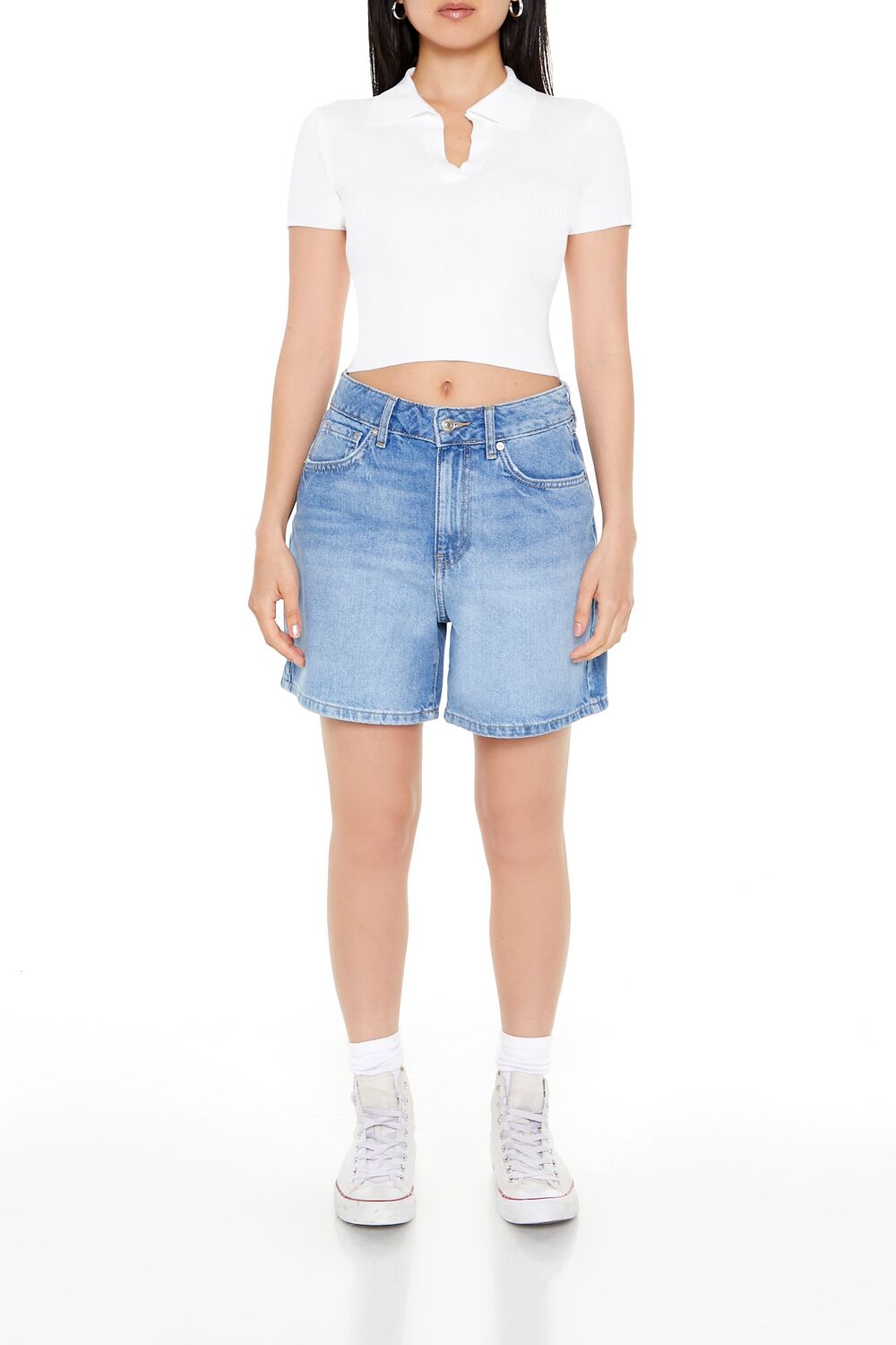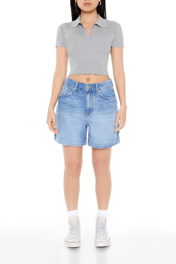 A ribbed sweater-knit top featuring short sleeves. a basic collar. split neckline. and a cropped hem.