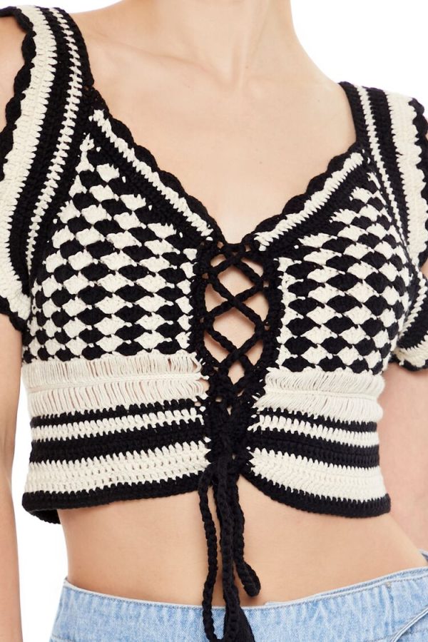A sweater-knit crop top featuring an allover geo pattern. V-neckline. flounce trim. and a lace-up front closure.