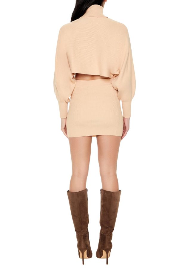 A sweater-knit set featuring a top with a turtleneck. raglan dolman sleeves. cropped hem. and ribbed trim. as well as a matching skirt featuring an elasticized high-rise waist. ribbed construction. and fitted silhouette.