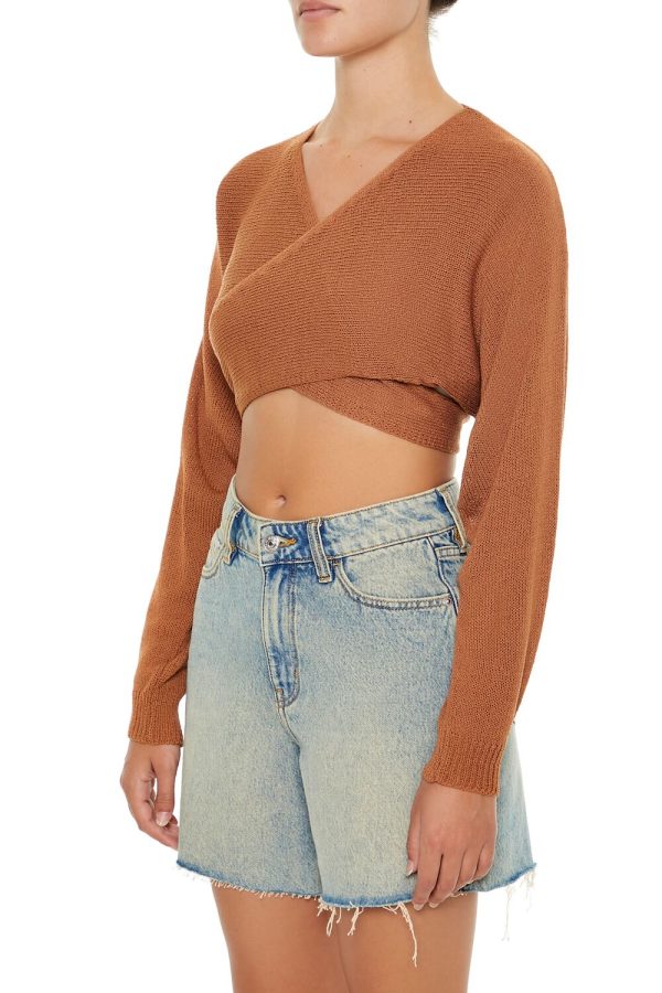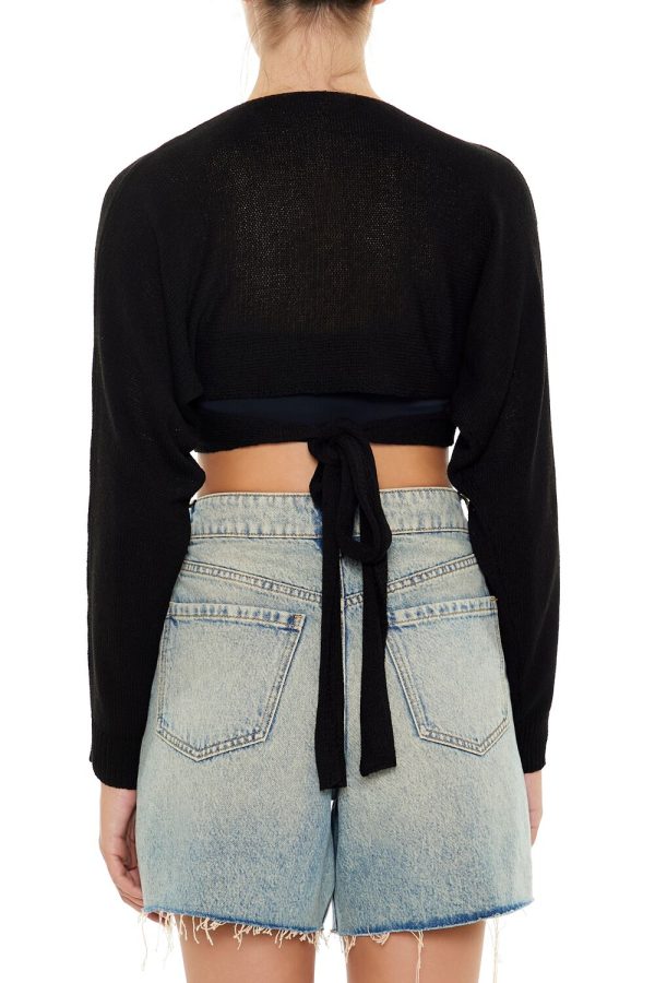 A knit sweater featuring a crossover design. cropped silhouette. surplice neckline. long sleeves. and a self-tie back closure.